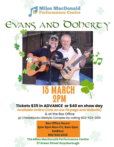 Kevin Evans & Brian Doherty have been an integral part of the East Coast music scene for over four decades. They have been together as Evans & Doherty for Thirty Nine years. To capture the essence of an Evans & Doherty performance, take a lively blend of traditional, original and contemporary songs, add a liberal sprinkling of stories and humour, then sit back and enjoy these fine entertainers.